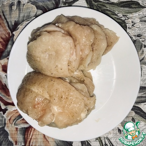 Каждый отбитый кусочек присыпать смесью соли и уцхо-сунели с одной стороны и сложить друг на друга стопочкой для лучшей пропитки.