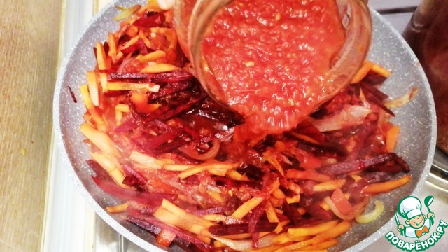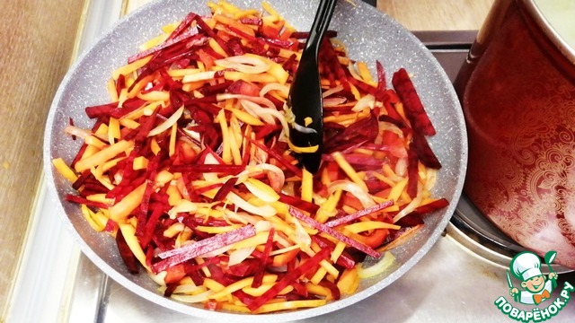 В сковородку вылить немного подсолнечного масла и начать обжаривать лук, через 3 минуты добавить морковь, еще через 3 минуты добавить болгарский перец и свёклу. Готовить 5 минут, пока овощи слегка не обжарятся. Сильно зажаривать их не нужно.