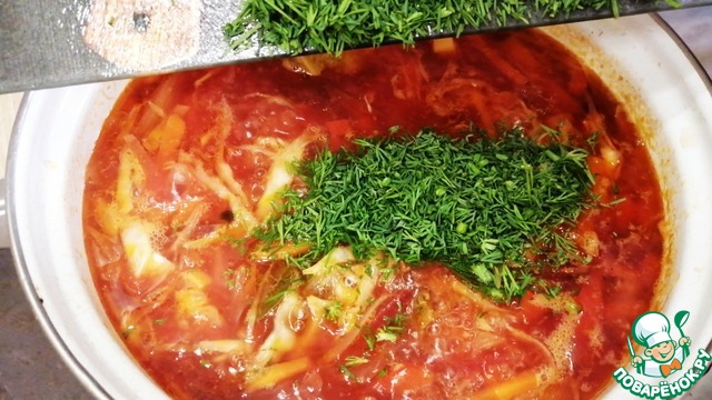 Нарезать укроп, добавить в кастрюлю, снять с плиты, накрыть крышкой и дать настояться 30 минут. При подаче в тарелку можно добавить сметану и выдавить зубчик чеснока.