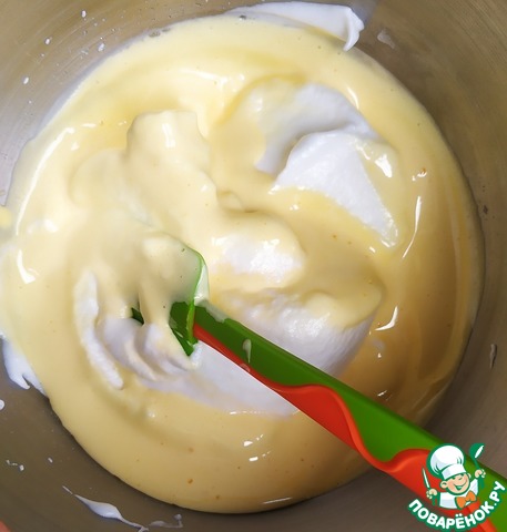 Далее, к белкам перелить желтки и аккуратно перемешать лопаткой.