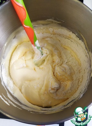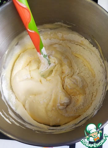 Добавить муку с разрыхлителем и тщательно перемешать до однородной массы.