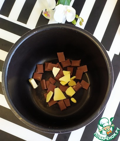 В чашу мультиварки-скороварки REDMOND выложить шоколад и сливочное масло. Закрыть крышку. Установить программу " МОЛОЧНАЯ КАША" время приготовления 10 минут. После готовности растопленный шоколад перемешать с маслом до однородной консистенции и переложить в кондитерский мешок.