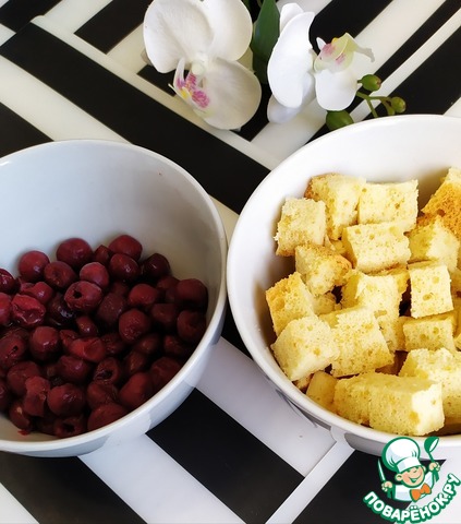 Замороженную вишню промыть. Остывший бисквит нарезать на квадратики. (для четырех трайфлов нам понадобится примерно 150 гр. бисквита.)