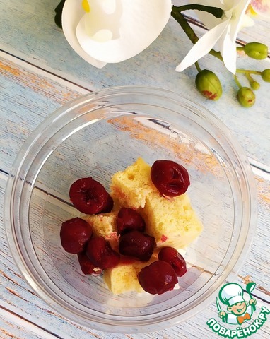 Затем сверху положить нарезанный бисквит и вишню.