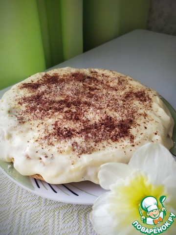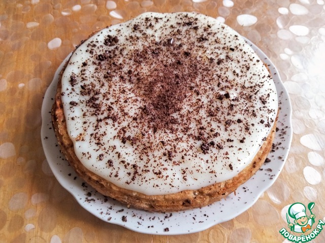 Сверху натереть на мелкой терке шоколад, его количество зависит на вас. У меня здесь две дольки шоколадного батончика с нугатовой начинкой.