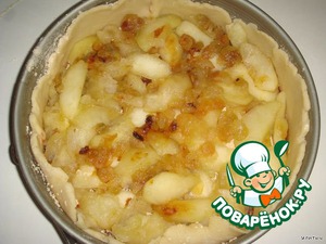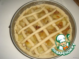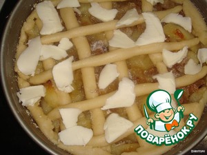 В кастрюльку сложить наши яблочки, добавить лимонный сок, сахар и изюм. Поставить на огонь на минут 15. Выпарить жидкость из яблок. Смазать форму для выпечки маслом. Достать из холодильника тесто и 2 /3 от куска раскатать, и уложить в форму, так, чтоб получились бортики. 1 /3 теста отложить в сторону. Намазать на тесто варенье(у меня сливовое) и посыпать панировочными сухарями. Они впитают в себя остатки яблочного сока. Сверху выложить нашу яблочную начинку. Посыпать корицей. Из оставшегося кусочка теста скатать жгутики и уложить поверх сеточкой. Присыпать ванильным сахаром и уложить кусочки сливочного масла.