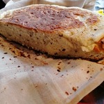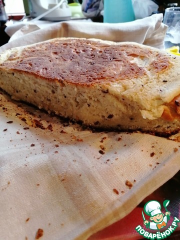 Далее накрыть хлеб бумагой для выпечки (смазать ее с одной стороны растительным маслом), положить наверх тарелку и перевернуть, достав со сковородки. Низ должен подрумяниться. Переложить полученную сдобу вниз пергаментом на сковороду, накрыть крышкой и оставить еще на 10-15 минут.