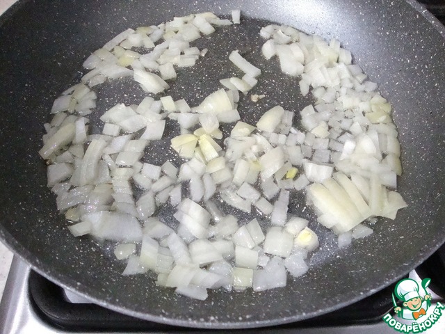 Нарезать лук небольшими кусочками и слегка обжарить в растительном масле. Мелко нарезанный чеснок добавить к луку.
