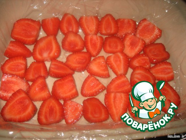 Выстилаем пищевой плёнкой блюдо и выкладываем дно порезанной пополам клубникой.
