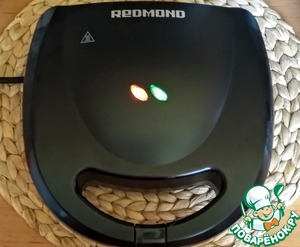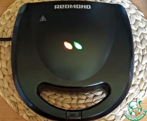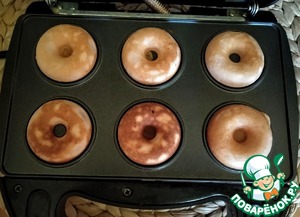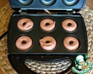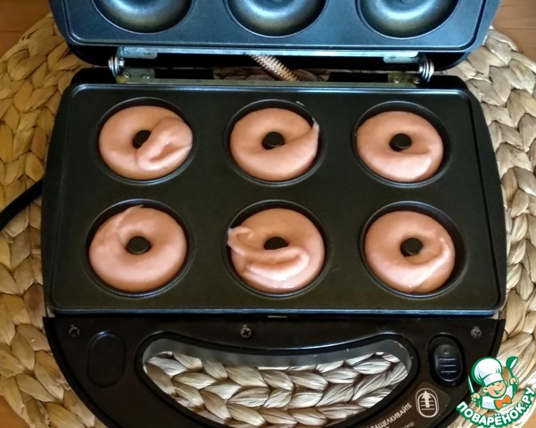 В мультипекарь Redmond вставить панели для пончиков. Включить мультипекарь, когда загорится зелёный индикатор можно начинать готовить. Заполнить нижние ячейки тестом, для этого я использовала кондитерский мешок.