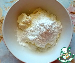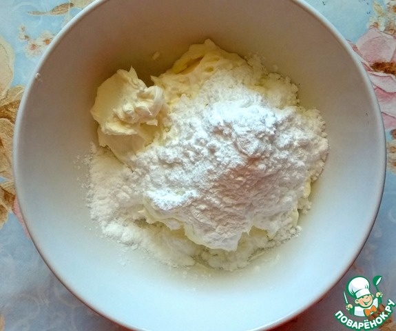 Для крема смешать творожный сыр и сливочное масло комнатной температуры. Добавить сахарную пудру.