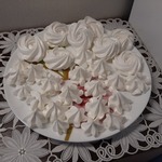 Безе выкладываем на противень с помощью кондитерского шприца или, как я, ложкой. Величина ложки у меня примерно = 2 чайные ложки. Количество ингредиентов мне хватает на форму диаметром 24 см, укладывается 15 шт.