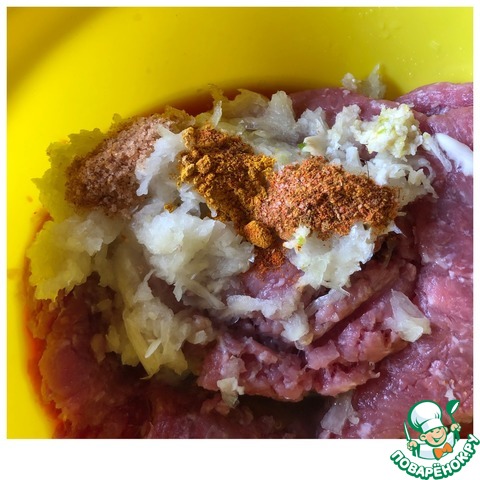 В фарш добавить соль, перец, карри и паприку. Натереть лук на крупной тёрке, чеснок 1 зубчик пропустить через пресс. Вымесить фарш.