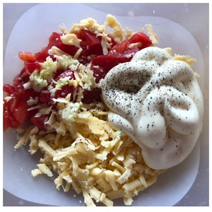 В пиале смешать майонез, чеснок пропущенный через пресс, молотый перец. Сыр натереть на крупной тёрке, помидор нарезать маленьким кубиком. Все перемешать.