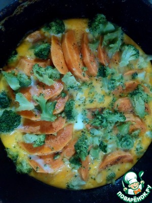 Когда наш «веер» станет почти готовым, посыпать его брокколи и залить взбитыми до однородного состояния яйцами. Еще раз посолить сверху. Можно посыпать зеленью. Дожарить под крышкой до готовности.