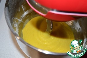 Дать смеси немного остыть, добавить яйца, смесь муки и дрожжей.