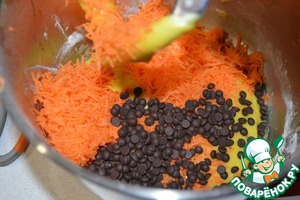 Ввести в тесто морковь, натертую на мелкой терке, шоколадные капли и миндальные лепестки.