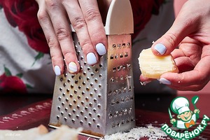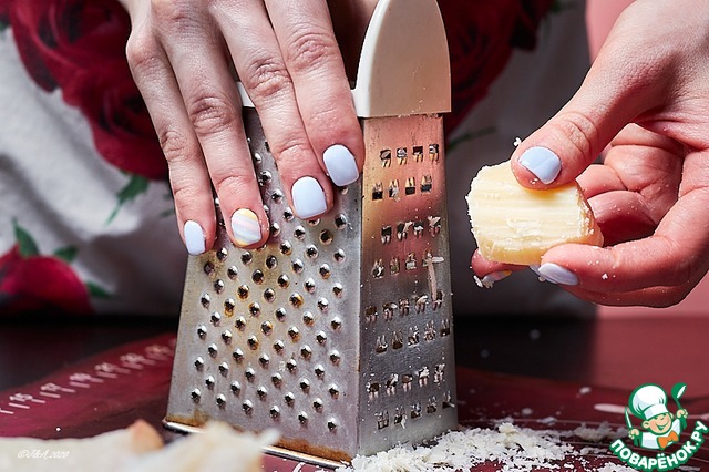 Сыр натрите на терке, той, которая делает максимально тонкие и плоские хлопья.