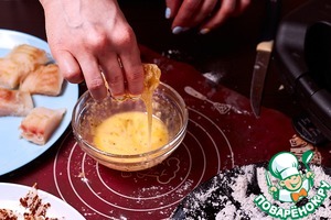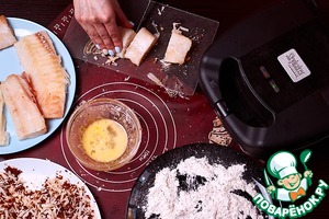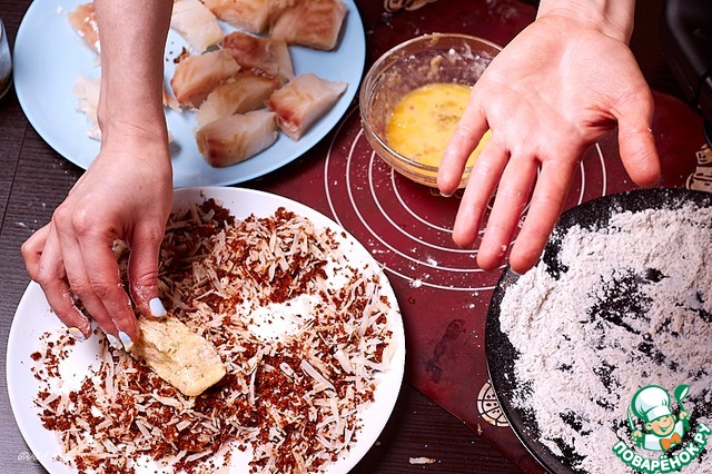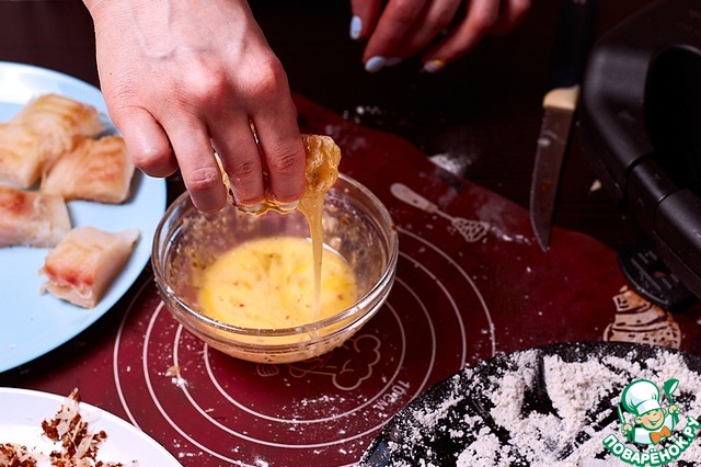 А теперь хитрость- одна рука у нас будет мокрая- ею мы макаем рыбу в яйцо. А вторая сухая- ею мы присыпаем кусочки панировкой. И никаких облепленных пальцев!