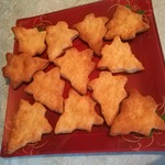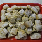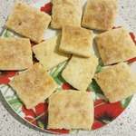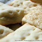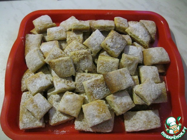3. Щедро присыпать стол мукой и раскатать тесто ( не тонко ). Подравнять края ( при желании ) и нарезать кусочками. Присыпать печенье сахаром и ещё раз пройтись скалкой ( придавить немного сахар ).