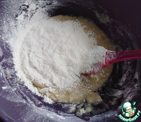 Всыпаем просеянную муку и хорошенько перемешиваем