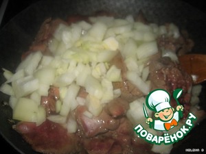 добавляем к ней измельчённый репчатый лук и жарим ещё минут 5