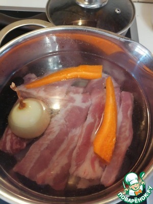 Складываем их в кастрюлю, добавляем половину луковицы и половину моркови, заливаем холодной водой и ставим вариться на 50-60 минут.