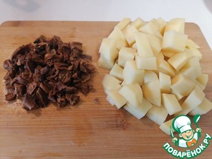 Время объединять все ингредиенты. Картофель режем кубиком, режем грибы, не мелко.