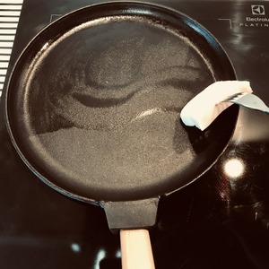 Сковорода прогрелась. Прибавляем огня (у меня индукция-в ней выбираю режим 10 из 14, на газу это должно быть чуть больше среднего). В тесто вливаем 2 столовые ложки подсолнечного масла, снова перемешиваем и приступаем к жарке. Сковороду промазываем салом.