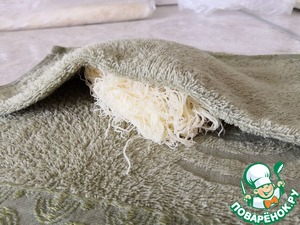 Разморозить тесто Катаифи, накрыть его мокрым полотенцем пока идет работа с ним.