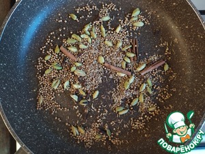 На раскалённой сковороде (без масла) немного поджарим нашим специи. Буквально 2 минуты, до появления сильного аромата. Осторожно, не пережарьте.