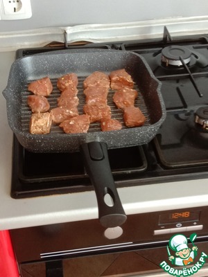 Замаринованное мясо выкладываем на заранее разогретую сковороду-гриль и жарим до готовности.
