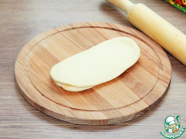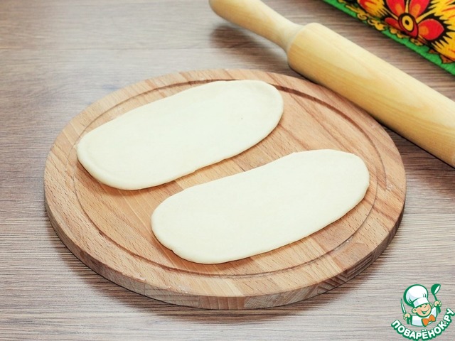 8. Раскатываем 2 части теста в продолговатые лепешки, длиной ~ 14 см.