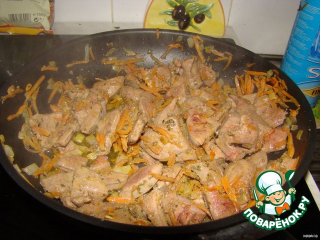 Порежьте печень мелкими кусками. Обжарим вместе с морковью и луком, добавьте петрушку (у меня не было свежей, добавила сушеную).