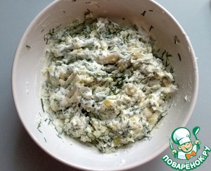 Для начинки брынзу размять с кефиром Добавить отварной картофель, натертый на крупной тёрке и мелко порезанный укроп. Хорошо перемешать.