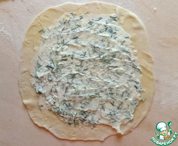 Тесто разделить на 10 частей. Каждую часть раскатать в тонкий круг. Смазать начинкой, примерно, 1-1,5 ст. л.