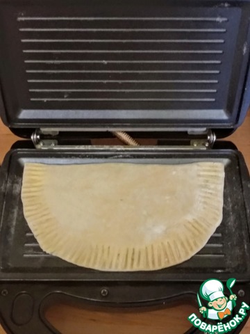 Сложить пополам, совсем слегка прокатать скалкой, чтобы избавится от лишнего воздуха. Скрепить края с помощью вилки.