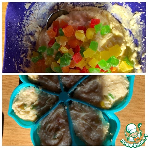 Добавить цукаты и хорошо перемешать тесто ложкой. Выкладывать тесто в формочки и отправить в духовку при 180 го минут на 20. Ориентируйтесь на сухую деревянную шпажку.
