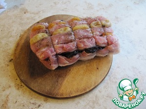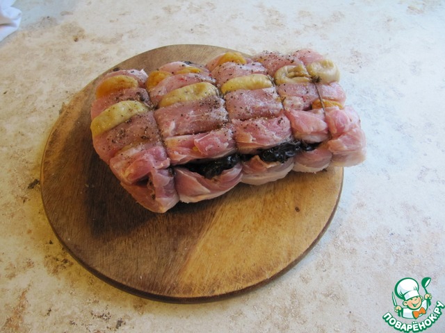 Мясо туго обвязать кулинарной нитью. Лучше подготовить мясо с вечера и отправить в холодильник на ночь, накрыв пищевой пленкой. Таким образом мясо напитается вкусом и ароматом сухофруктов!