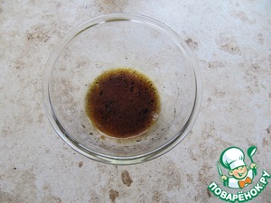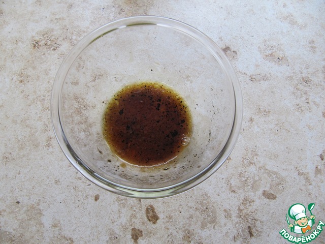 Для соуса смешать жидкий мед, бальзамический уксус, растительное масло в пропорциях по-своему вкусу, по желанию можно добавить соевый соус, специи.