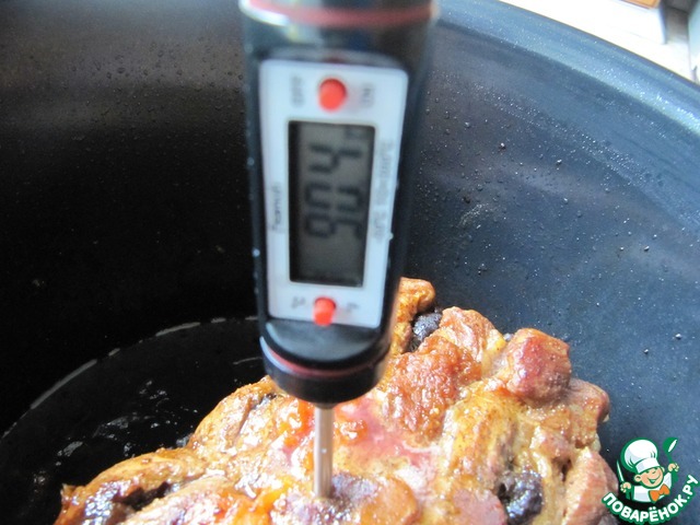 Для запекания мяса использую мультиварку от REDMOND. Устанавливаю режим «Выпечка» на 60 минут. Спустя 15 минут необходимо открыть крышку мультиварки, чтобы осторожно перевернуть мясо и добавить 50 мл воды, если мясного сока не хватает и мясо может пригореть! За час приготовления в режиме "Выпечка"переворачивала кусок 4 раза, чтобы со всех сторон мясо подрумянилось, по необходимости доливала воду, если мясного сока не хватало. После окончания программы установила дополнительную программу "Мультиповар" на 15 минут температура 140С или программу "Тушение" до готовности мяса и влила соус (рецепт ниже).