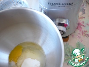 В чаше планерного миксера "REDMOND" соединить яйцо, добавить оставшийся сахар и соль. Взбить с помощью насадки "венчик" на небольшой скорости минуты 2-3.