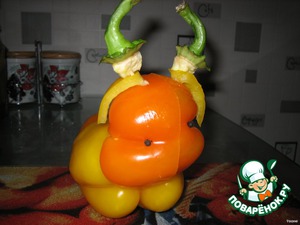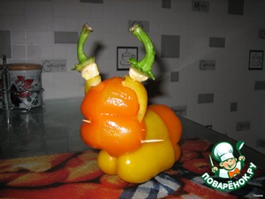 Острый кончик перца разрезать пополам, соединить половинки выпуклой стороной, прикрепить зубочистками рога и ушки.
