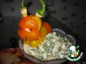 Все перемешать, заправить майонезом, выложить горкой в салатник.