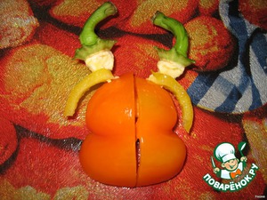 Сделать рога из плодоножки перца, разрезав ее вдоль.