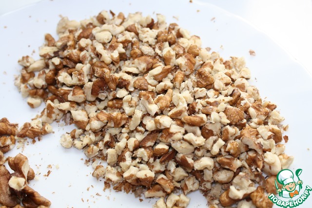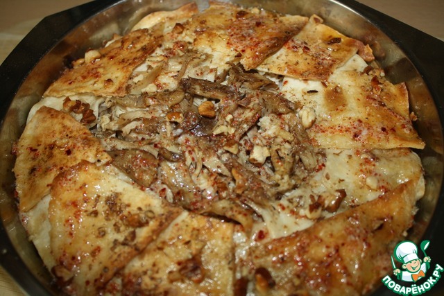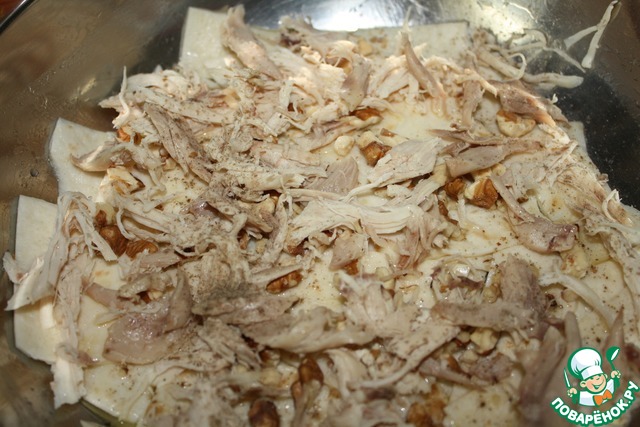 Посыпаем мясом и орехами, перчим черным перцем по вкусу и на каждый слой выливаем по 5 ст. ложек бульона.