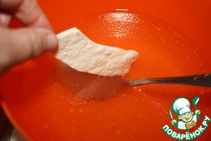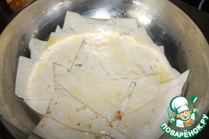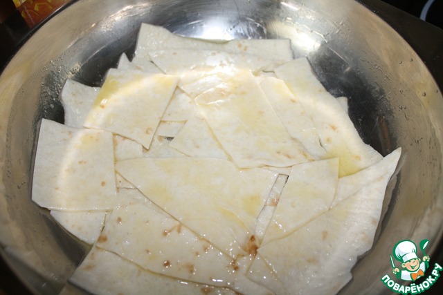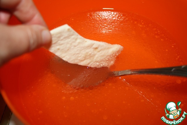 Окунаем каждый кусочек лаваша и выкладываем в один слой в форму.