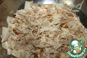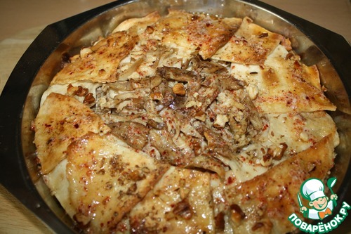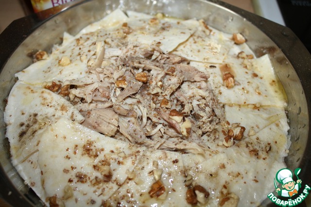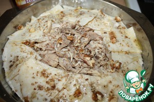 Затем повторяем слои: выкладываем лаваш, смазываем маслом и опять кладем на него курицу и орехи, поливаем бульоном и перчим,