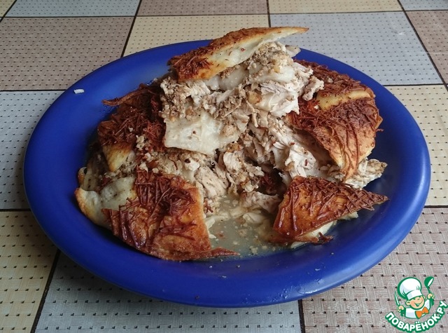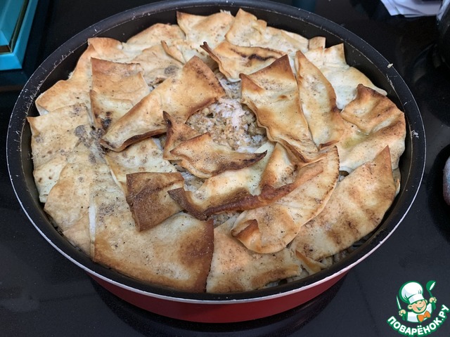 затем опять слой лаваша, который окунаем в бульон, и снова повторяем.
