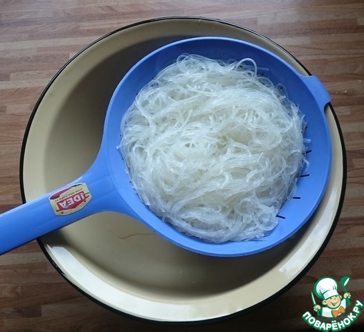 Добавляем фунчозу к овощам и всё очень хорошо перемешиваем.